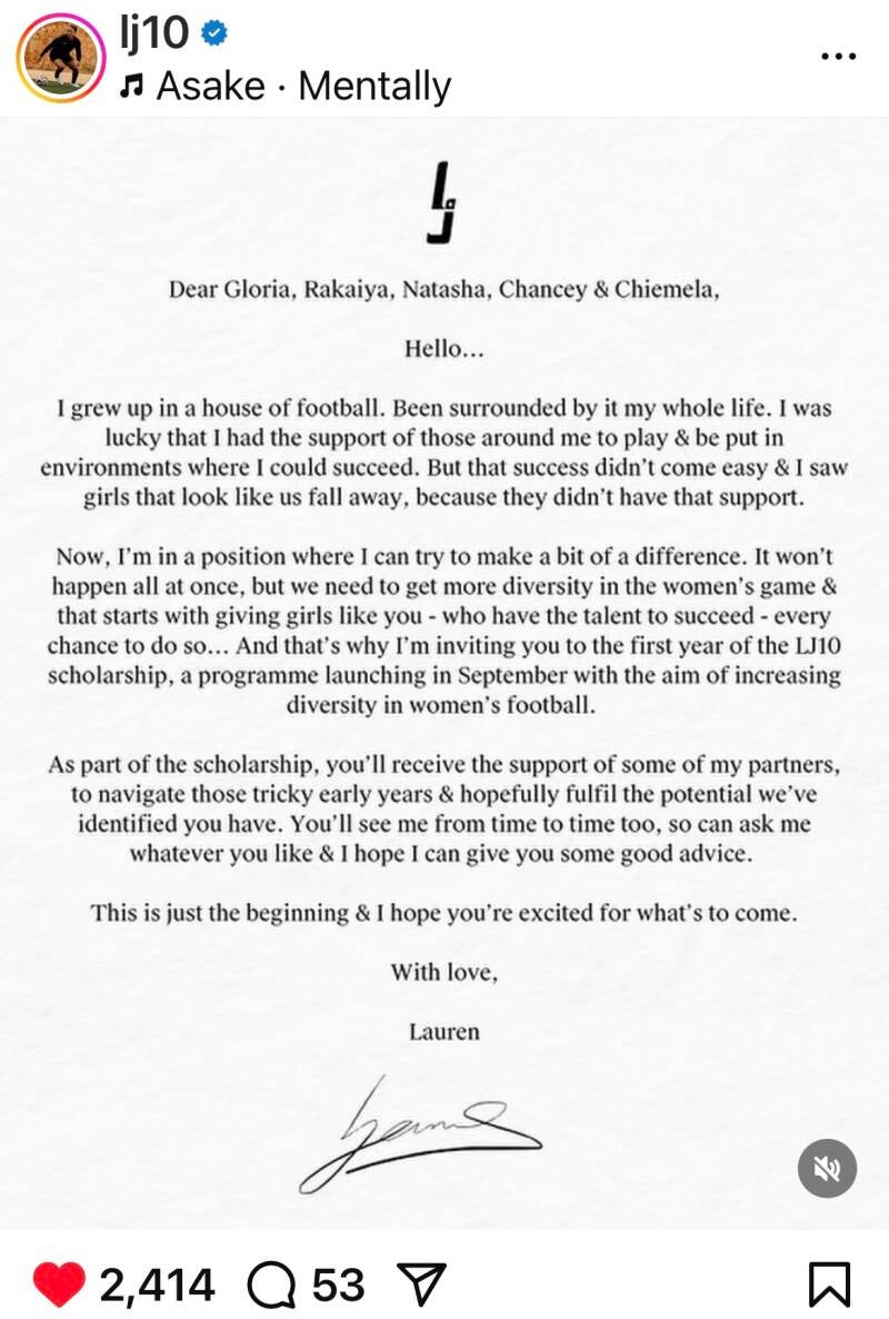 LJ10 announced on Instagram today that she will use her outlet and resources to support individuals and boost diversity in women's football. The Blue recounts her childhood and how her parents gave her the platform and encouragement to push for her desire. James said, “I grew up in a house of football. I have been surrounded by it my whole life. I was lucky that I had the support of those around me to play & be put in environments where I could succeed. But that success didn't come easy & I saw girls that look like us fall away because they didn't have that support.”